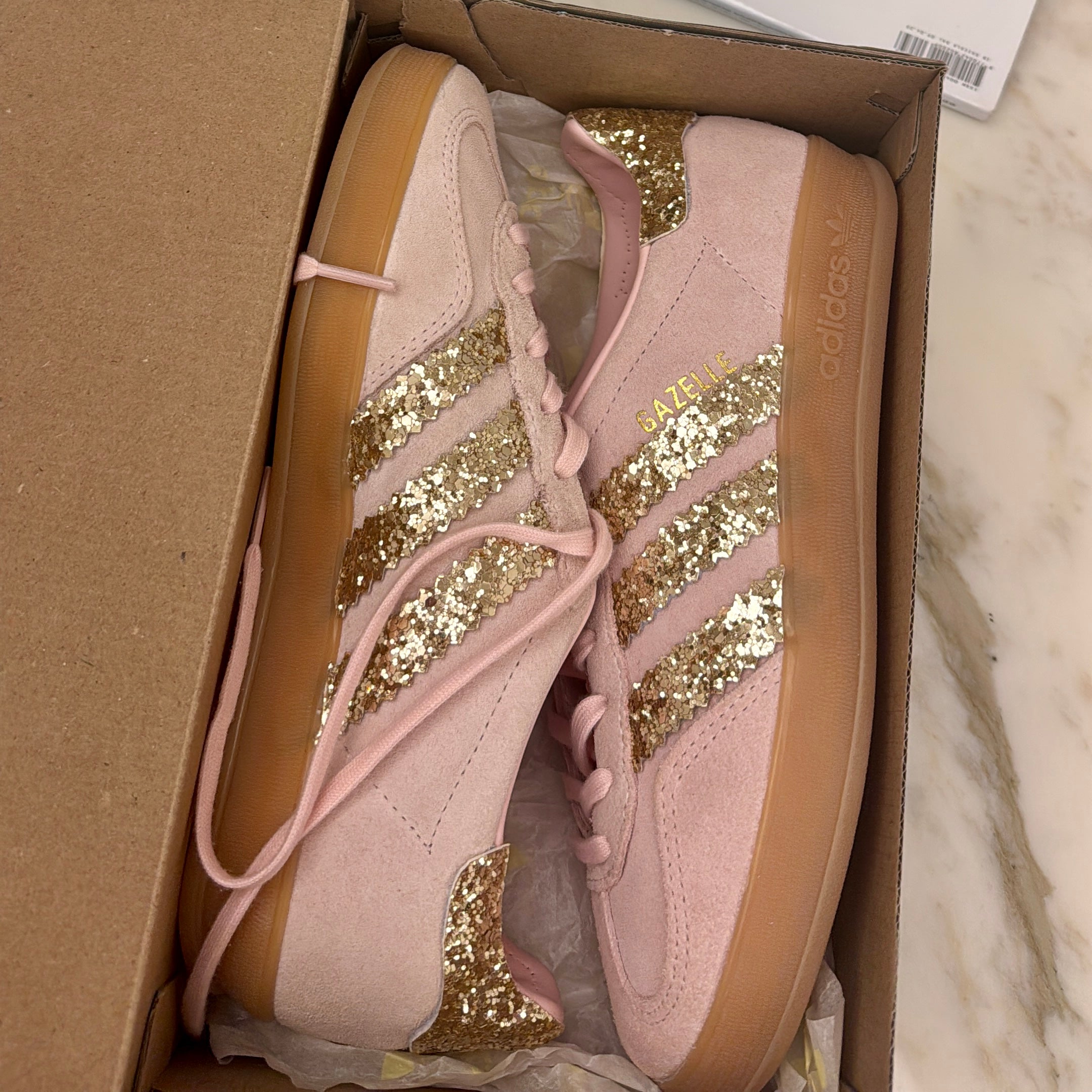 Nate come scarpe da training indoor, le adidas Gazelle sono diventate nel tempo un'icona intramontabile. Fedeli alla versione originale, queste sneakers sono personalizzate con un glitter champagne finemente cucito.