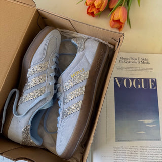 Nate come scarpe da training indoor, le adidas Gazelle sono diventate nel tempo un'icona intramontabile. Fedeli alla versione originale, queste sneakers sono personalizzate con un glitter argento finemente cucito.